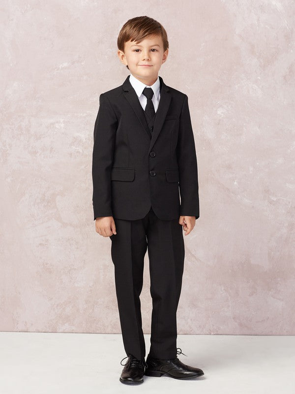This 5-piece set includes the jacket, pants, shirt, vest and necktie.