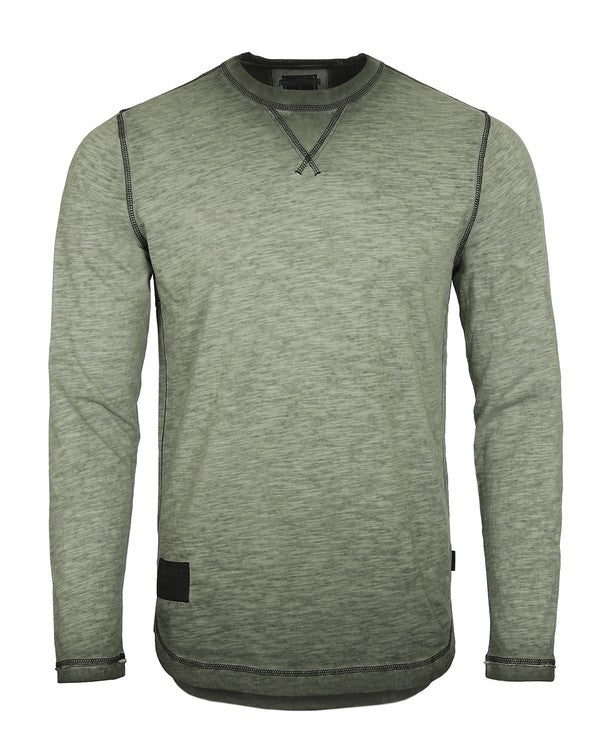 - Dusty Silver Oil Wash with Contrast seam lines, Double layered raw edge on sleeve and bottom hem, Round Bottom